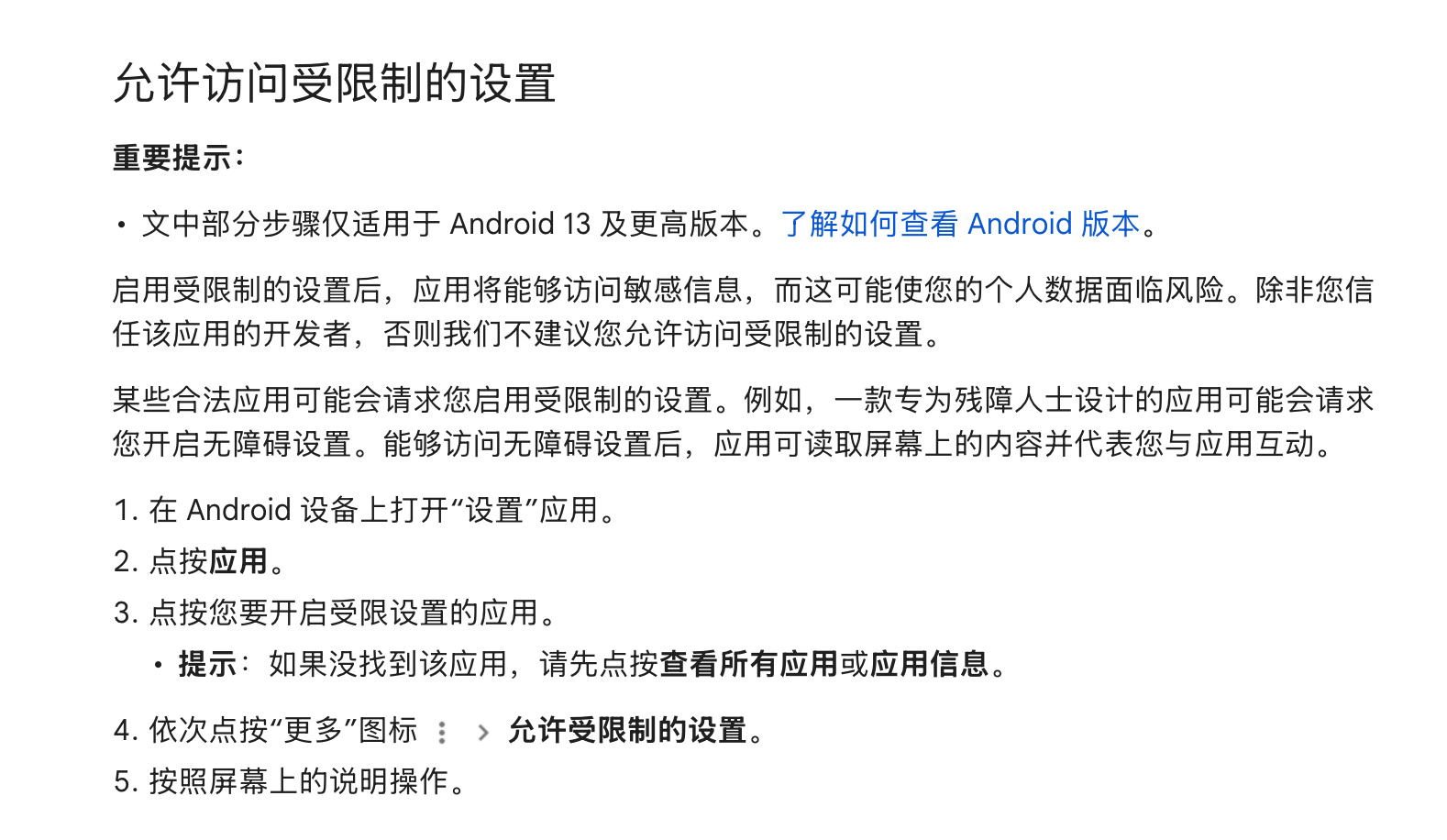 原因: 如果安装包不是来自手机自带应用商店的话,部分机型会限制无障碍功能。下面是来自 Google 的解释(原文链接):